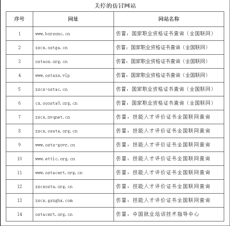 根据网络巡查和群众举报情况,人力资源社会保障部联合有关部门查实并关停了14个仿冒网站,其网站名称、网址及页面内容与人力资源社会保障部技能类“职业资格证书”“职业技能等级证书”(以下简称技能类评价证书)查询官方网站高度相似,容易误导社会公众。目前,上述14个网站均已被关停。