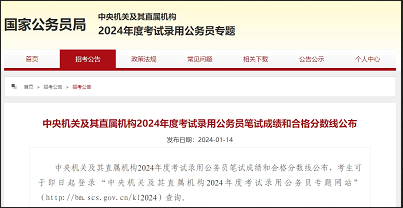中央机关及其直属机构2024年度考试录用公务员笔试成绩和合格分数线公布,考生可于即日起登录“中央机关及其直属机构2024年度考试录用公务员专题网站”(http://bm.scs.gov.cn/kl2024)查询。